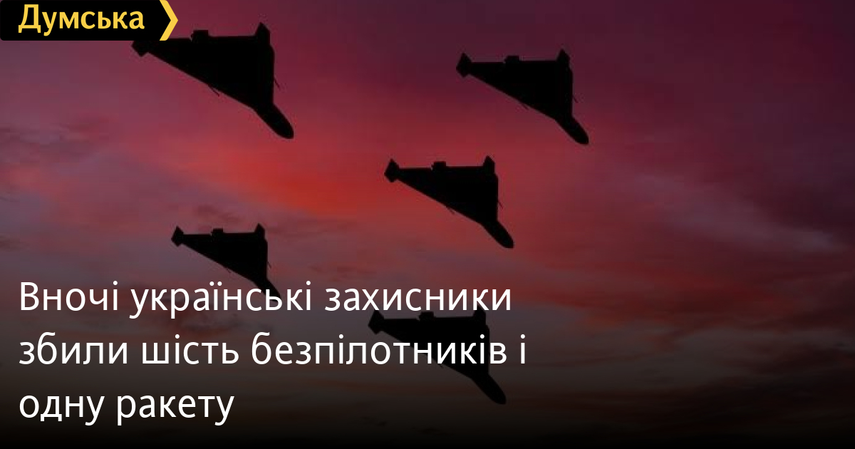 Вночі українські захисники збили шість безпілотників і одну ракетуСім ворожих цілей знищили Сили оборони України в ніч на 17 жовтня. Як повідомили в командуванні Повітряних сил, ворог під час чергової змішаної атаки застосував шість ударних БпЛА типу Shahed-136/131 із району мису Чауда (Крим) та одну керовану авіаційну ракету Х-59 із літака Су-34. Усі сім цілей знищили українські захисники. Також противник використав дві зенітні керовані ракети С-300 на східному напрямку. СМЕРТЬ РОСІЙСЬКИМ ОКУПАНТАМ! Помітили помилку? Виділяйте слова з помилкою та натискайте control-enter |