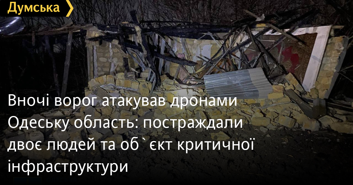 Вночі ворог атакував дронами Одеську область: постраждали двоє людей та об`єкт критичної інфраструктуриДвоє людей дістали поранення внаслідок удару окупантів по Одеській області минулої ночі. Як повідомив голова обласної військової адміністрації Олег Кіпер, в Одесі від вибухової хвилі постраждала 61-річна жінка, яка дістала травми обличчя осколками скла. Її госпіталізували. Частково зруйновано приватний житловий будинок, пошкоджено приміщення СТО, автомагазин, легкові та вантажні автомобілі. У передмісті Одеси в будівлі приватного підприємства пошкоджено дах, вікна та двері. Постраждав від удару і Чорноморськ, там поранено 53-річного чоловіка, якого госпіталізували в стані середнього ступеня тяжкості. Через пошкодження об'єкта критичної інфраструктури місто залишилося без електропостачання, але вже до ранку його відновили. СМЕРТЬ РОСІЙСЬКИМ ОКУПАНТАМ! Помітили помилку? Виділяйте слова з помилкою та натискайте control-enter