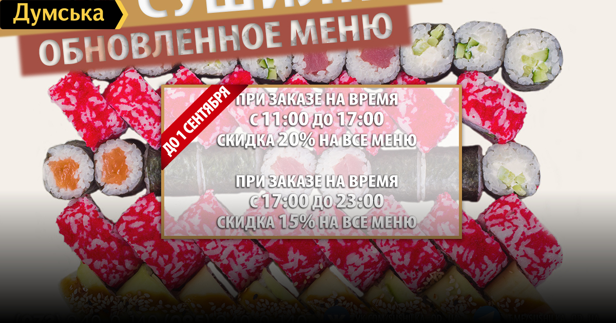 Служба доставки суши «Сушилка» от «Одесса как она есть» обновила меню. Отныне клиентам сервиса дополнительно доступны два новых сета и порядка 10 новых роллов на любой вкус. Также напомним, что до 1 сентября действует акция: при заказе на время в период с 11:00 до 17:00 вы получаете скидку 20% на все меню, а при заказе на время с 17:00 до 23:00 — 15%. Подробней ознакомиться с ассортиментом и правилами доставки можно на сайте sushilka.od.ua. Совершить заказ можно по телефонам: 073-240-0-140; 095-240-0-140; 096-240-0-140; 048-735-29-99. СМЕРТЬ РОСІЙСЬКИМ ОКУПАНТАМ! Помітили помилку? Виділяйте слова з помилкою та натискайте control-enter |
