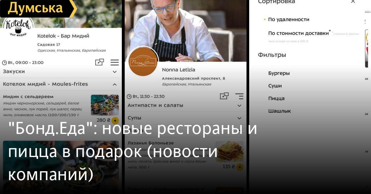 Служба быстрой доставки «Бонд.Еда» продолжает радовать своих клиентов новыми ресторанами и акциями от заведений. Недавно к сервису присоединился ресторан бельгийской кухни «Kotelok — Бар Мидий» — победитель ресторанной премии «Соль» в номинации «Лучшее городское кафе», ресторан Nonna Letizia с блюдами итальянской кухни от Роберто Армароли, семейная пиццерия Food Court в суворовском районе Одессы, ресторан быстрого питания Your Burger и, недавно открывшийся на Фонтанской дороге, ресторан-паб Greenwich. Помимо постоянных акций сервиса, на этой неделе действует акция 1+1=3 от пиццерии Pizza Roll To Go (при заказе двух больших пицц пицца «Маргарита» в подарок) и в кафе Wild Sandwich (при заказе двух любых блюд, ролл «Фалафель» в подарок). Есть обновления и в интерфейсе: в сервисе добавлены фильтры и сортировка по стоимости доставки. «Бонд.Еда» сотрудничает с более чем 180 ресторанами и кафе Одессы. Заказать еду можно из приложения такси «Бонд» или на сайте eda.bond.od.ua СМЕРТЬ РОССИЙСКИМ ОККУПАНТАМ! Заметили ошибку? Выделяйте слова с ошибкой и нажимайте control-enter |
