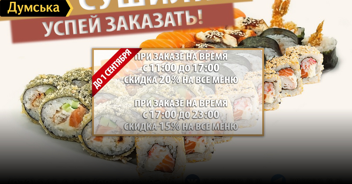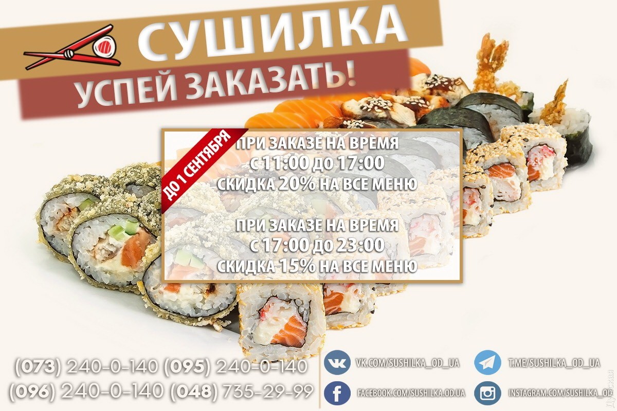 Новые акции от «Сушилки»: скидки на все меню и доставка за город (на правах рекламы)С 21 августа у службы доставки суши «Сушилка» от «Одесса как она есть» стартует новая акция. Так, при заказе на время в период с 11:00 до 17:00 вы получаете скидку в 20% на все меню, а при заказе на время с 17:00 до 23:00 — 15%. Кроме того, «Сушилка» расширяет зону доставки. Отныне возить суши будут не только в центр города, на Таирова, Фонтан, Молдаванку, Черемушки, Бугаевку и Слободку, но и в Черноморку, Червоный хутор и Совиньон. Подробно ознакомиться с ассортиментом и правилами доставки можно на сайте sushilka.od.ua. Совершить заказ можно по телефонам: 073-240-0-140; 095-240-0-140; 096-240-0-140; 048-735-29-99. СМЕРТЬ РОСІЙСЬКИМ ОКУПАНТАМ! Помітили помилку? Виділяйте слова з помилкою та натискайте control-enter |
