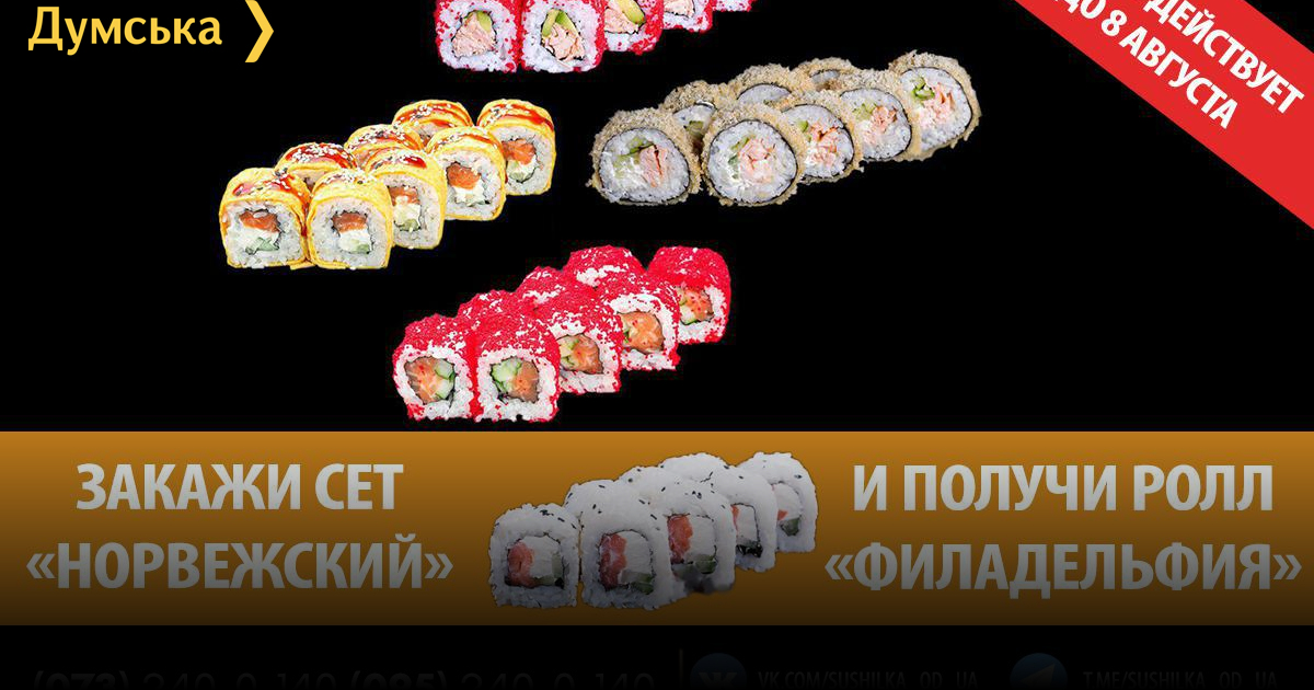 Новые акции: “Сушилка” дарит ролл “Филадельфия” за заказ сета (на правах рекламы)До 8 августа включительно в «Сушилке» действует вкусная акция, в рамках которой каждый, кто закажет новый сет «Норвежский», получит в подарок ролл «Филадельфия». Таким образом, всего за 400 гривен вы получите 40 кусочков весом 1,2 кг. Также сервис добавил новый сет «Таносими», в состав которого вошли роллы «Момиджи», «Калифорния Унаги», «Икута» и «Ниджи». Заказ можно сделать на сайте sushilka.od.ua или по телефонам: 073-240-0-140; 095-240-0-140; 096-240-0-140; 048-735-29-99. СМЕРТЬ РОСІЙСЬКИМ ОКУПАНТАМ! Помітили помилку? Виділяйте слова з помилкою та натискайте control-enter |