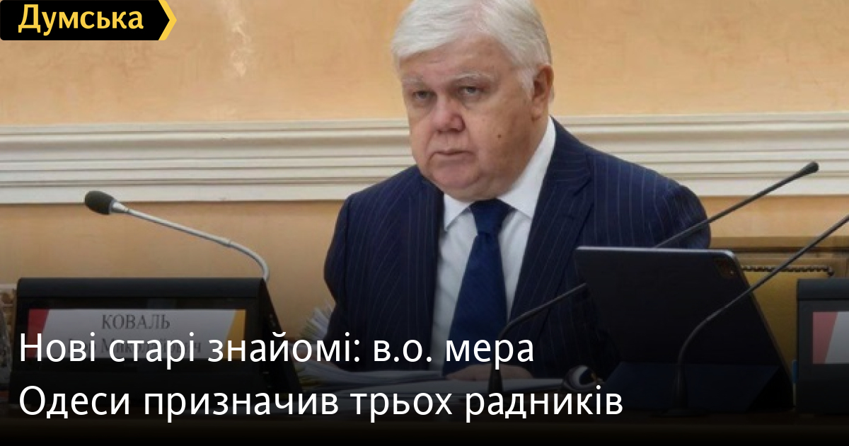 Нові старі знайомі: в.о. мера Одеси призначив трьох радниківТроє радників з'явилися у в.о. міського голови Ігоря Коваля. Двоє з них обіймали аналогічні посади за часів Геннадія Труханова. Так, згідно з розпорядженням Коваля, Вероніка Етнарович, дружина колишнього заступника прокурора області Віталія Етнаровича, стала радником з цифрового розвитку та соціально-гуманітарних питань. «Думська» вже писала про те, що вона намагалася видати фінансовані з бюджету міста роботи за власні досягнення. Ексвіцемер Олена Павлова, яка з 2015 року працювала радницею Труханова, тепер опікуватиметься сферою культури, мистецтва та туризму. Обидві входили до списку з 22 радників і консультантів, діяльність яких 17 жовтня припинив сам Коваль. Новою особою в мерії став Антон Скуфінський. Його направлення силовий блок, взаємодія з правоохоронними органами та питання оборони. За даними джерел «Думської», Скуфінський — непублічна фігура. Відзначається, що радники призначені на рік та працюватимуть на громадських засадах, тобто без зарплат і формальних повноважень. СМЕРТЬ РОСІЙСЬКИМ ОКУПАНТАМ! Помітили помилку? Виділяйте слова з помилкою та натискайте control-enter