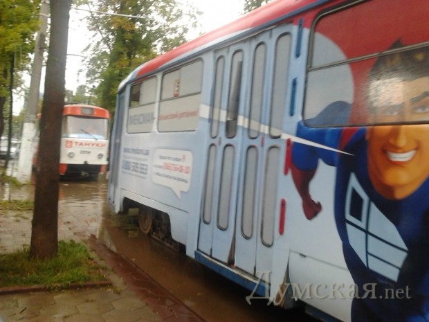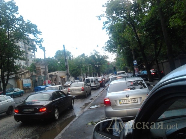 Часть Французского бульвара — там, где сейчас проходит ремонт, — превратилась в огромную лужу. Машины объезжают ее по трамвайным путям и тротуару. Правила дорожного движения нарушают даже маршрутки. В районе киностудии образовался затор из нескольких трамваев.