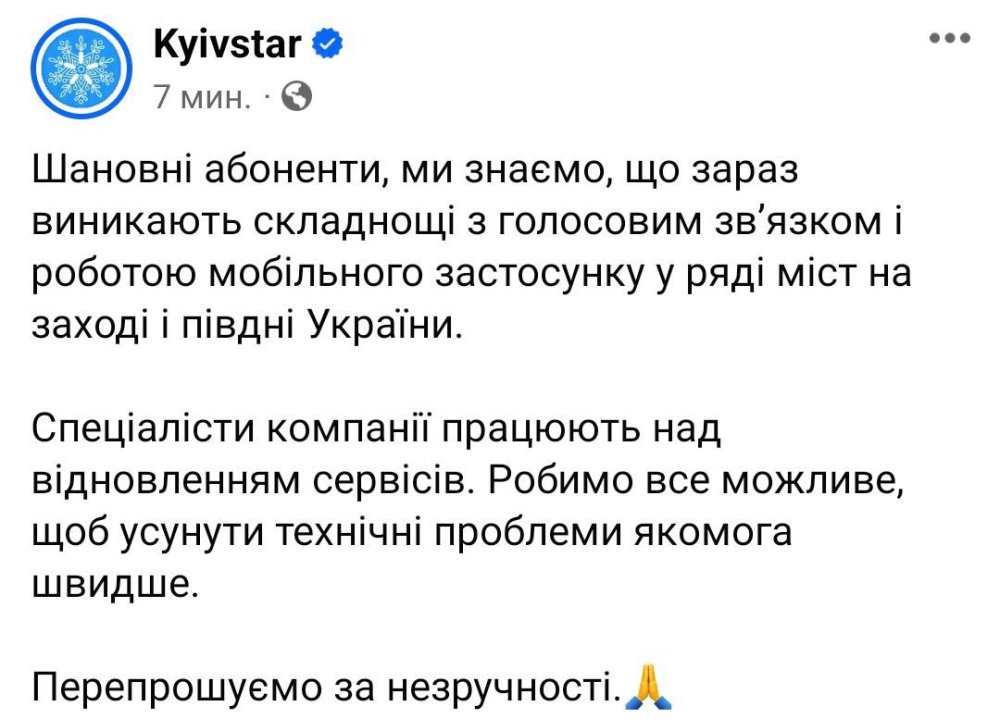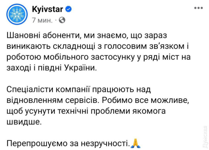 Новий збій у «Київстар»: абоненти скаржаться на проблеми зі зв`язком та інтернетом (оновлено)Абоненти «Київстар» знову скаржаться на проблеми зі зв'язком. Як передає кореспондент «Думської», з перебоями працює і інтернет, і дзвінки всередині мережі та на номери інших операторів. У компанії ситуацію поки не коментують. Тільки вчора в компанії заявили про стабілізацію роботи і нормальне функціонування 99% базових станцій. ОНОВЛЕНО О 08:50. В «Київстар» повідомили, що знають про складнощі з голосовим звʼязком і роботою мобільного застосунку. Проблеми виникли у низці міст на заході та півдні України. «Спеціалісти компанії працюють над відновленням сервісів. Робимо все можливе, щоб усунути технічні проблеми якомога швидше», — запевняють в компанії. СМЕРТЬ РОСІЙСЬКИМ ОКУПАНТАМ! Помітили помилку? Виділяйте слова з помилкою та натискайте control-enter |