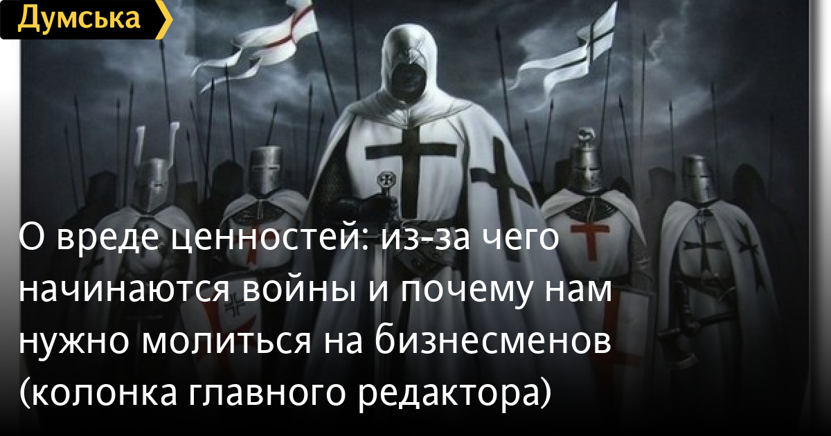 Наступлю на горло собственной левацкой песне и брошу камень в пресловутые «ценности», которые есть и у меня, и у каждого из вас. Уверен: именно они, идеальные представления отдельных людей и многомиллионных масс о мире, его прошлом, настоящем и будущем, зачастую являются первопричиной зла. Ортодоксальные марксисты, наверняка, заплюют меня, но ведь существует масса примеров того, что именно они, ценности, далеко не всегда служат прикрытием корыстных мотивов, а являются самодостаточным фактором, двигающим людей на кровавые крайности. Крестовые походы, гражданская война в России, эпопея США на Ближнем Востоке, закончившаяся появлением ИГИЛ, и наконец, украинские события — разве везде здесь можно усмотреть бизнес-интерес? «Петр и Мазепа» по поводу Ирака хорошо написали, не буду повторяться.