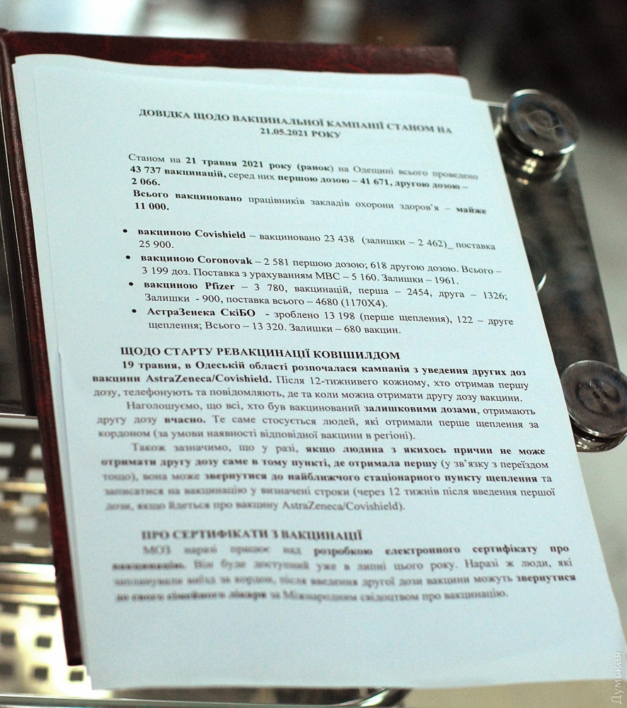 В целом отчет о ситуации и планы областного штаба выглядят достаточно оптимистично. Единственное, что вселяет опасение — судьба оставшихся на складах 900 доз вакцины от Pfizer. Дело в том, что по «Дорожной карте», утвержденной приказом МОЗ № 3018, на региональном уровне такие вакцины должны храниться при температуре от +2°C до +8°C или с применением сухого льда не больше пяти дней. Первые партии этой вакцины прибыли в Одесскую область более месяца назад — 18 апреля 2021 года.