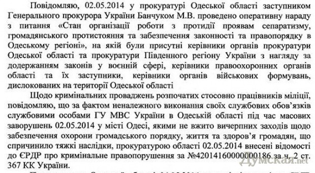 Отметим, что что ранее Генеральный прокурор Украины обвинил своего заместителя Николая Банчука в том, что именно он принял решение выпустить на свободу 63 задержанных активистов Куликова поля из здания городского УВД 4 мая 2014 года. Генпрокурор назвал такое решение преступным. В то же время, как следует из ответа прокуратуры области, уголовное дело №42014160000000160 по данному факту было возбуждено в отношении должностных лиц горУВД.