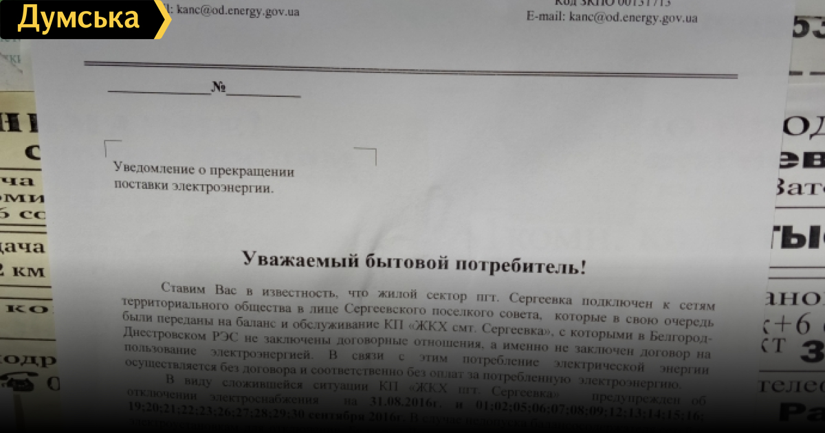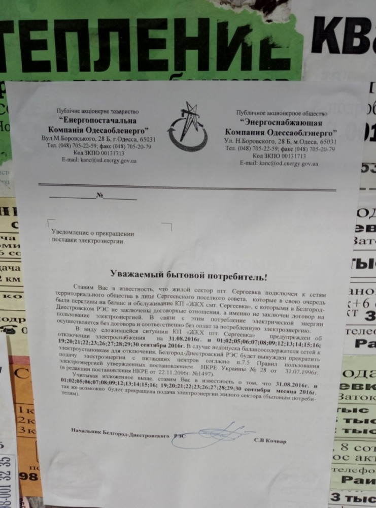 Облэнерго грозит отключить от электроснабжения жителей курортного поселка из-за долгов местного КПКомпания «Одессаоблэнерго» разместила на улицах поселка Сергеевка Белгород-Днестровского района объявления с угрозами отключить потребителей от энергоснабжения. Об этом сообщает пресс-служба Сергеевского поселкового совета. Причиной таких мер называется незаключение договора между «Одессаоблэнерго» и КП «ЖКХ пгт. Сергеевка». «Договор между облэнерго и КП действительно до сих пор не подписан, а переговорный процесс зашел в тупик. Дело в том, что «Одессаоблэнерго» настаивает на немедленной выплате задолженности в 14 млн грн, накопленной с 2006 по 2015 годы, не желая оплачивать стоимость транзита электроэнергии для бытовых потребителей через Сергеевские энергосети — в пользу КП «ЖКХ пгт. Сергеевка». При этом нам неоднократно заявлялось, что мы можем оплатить эту задолженность — если передадим (отдадим в счет долга) Сергеевские энергосети, принадлежащие громаде, на баланс «Одессаоблэнерго». Подобные условия для нас неприемлемы, мы готовы решать вопрос в судебном порядке», — пояснили в поссовете. Объявления руководство поселка расценивает как попытку надавить через население: «Это угрозы в стиле рэкетиров 90-х годов, под которыми подписывается начальник Белгород-Днестровского РЭСа. Подобные требования полностью противоречат законодательству Украины и нами уже готовятся обращения в СБУ и прокуратуру по поводу угроз руководства облэнерго в отношении бытовых потребителей, у которых заключены прямые договоры на поставку электроэнергии и отключать их за «долги» нашего предприятия (которые еще надо доказать) у энергетиков нет никакого права», — говорится в сообщении. СМЕРТЬ РОСІЙСЬКИМ ОКУПАНТАМ! Помітили помилку? Виділяйте слова з помилкою та натискайте control-enter |