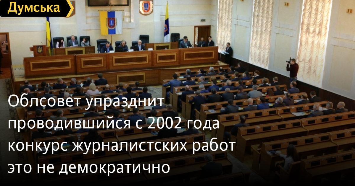 Облсовет упразднит проводившийся с 2002 года конкурс журналистских работ – это не демократичноОблсовет больше не будет проводить конкурс журналистских работ по освещению деятельности органов местного самоуправления. Соответствующий проект решения выносится на ближайшую сессию. В пояснительной записке говорится, что в демократичной стране подобный конкурс, который проводился с 2002 года, потерял актуальность. «Данная методика взаимодействия органов власти и средств массовой информации устарела и вызывает критику большинства независимых СМИ, которые играют важную роль в становлении общественного мнения и влияют на социально-политические процессы в Одесском регионе», — говорится в пояснительной записке к проекту решения. СМЕРТЬ РОСІЙСЬКИМ ОКУПАНТАМ! Помітили помилку? Виділяйте слова з помилкою та натискайте control-enter |
