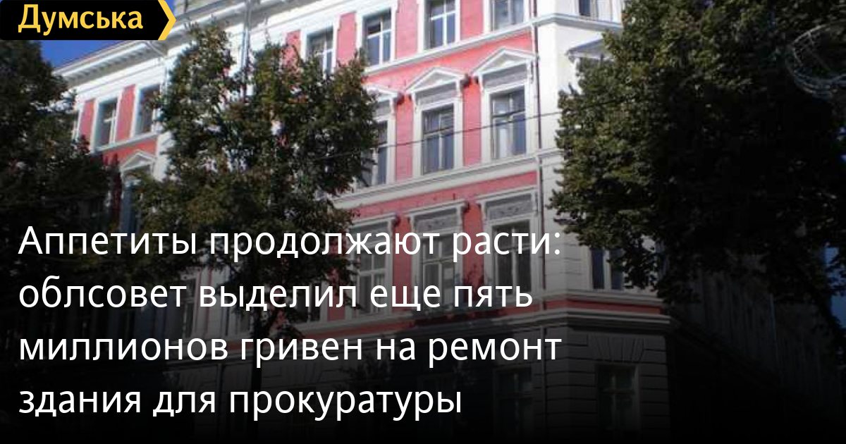 У областных властей другие мотивы. По словам директора департамента финансов ОГА Марины Зинченко, дополнительные деньги ускорят переезд на новые рабочие места сотрудников прокуратуры. Это позволит освободить находящееся в областной коммунальной собственности здание на углу Жуковского и Польской, которое они сейчас занимают.