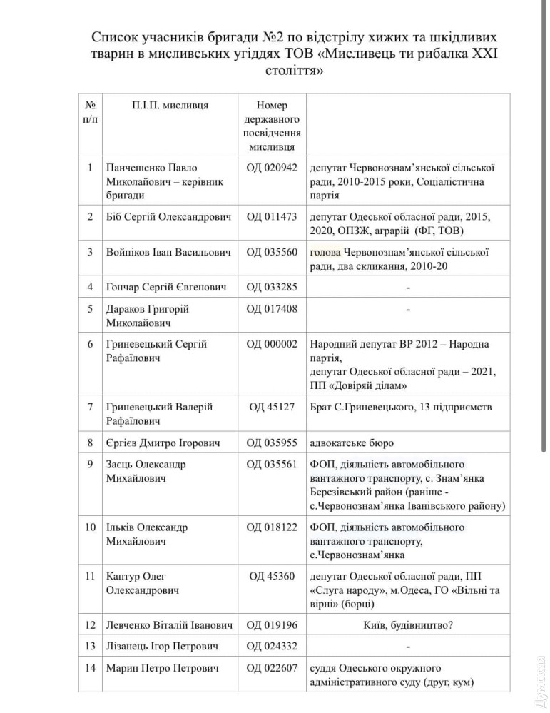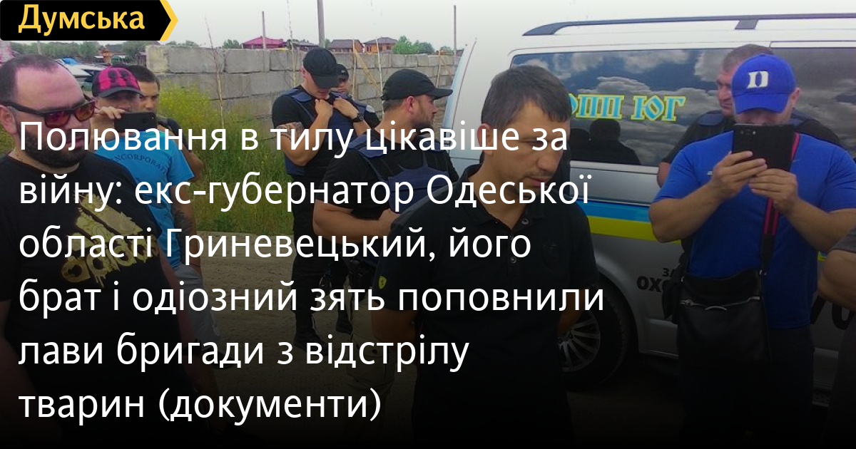 Ексгубернатор Одеської області та колишній нардеп Сергій Гриневецький, його брат Валерій Гриневецький, зять Григорій Мельниченко і батько останнього Віктор Мельниченко увійшли до складу бригади №2 з відстрілу хижих і шкідливих тварин у мисливських угіддях компанії «Мисливець та рибалка XXI століття».