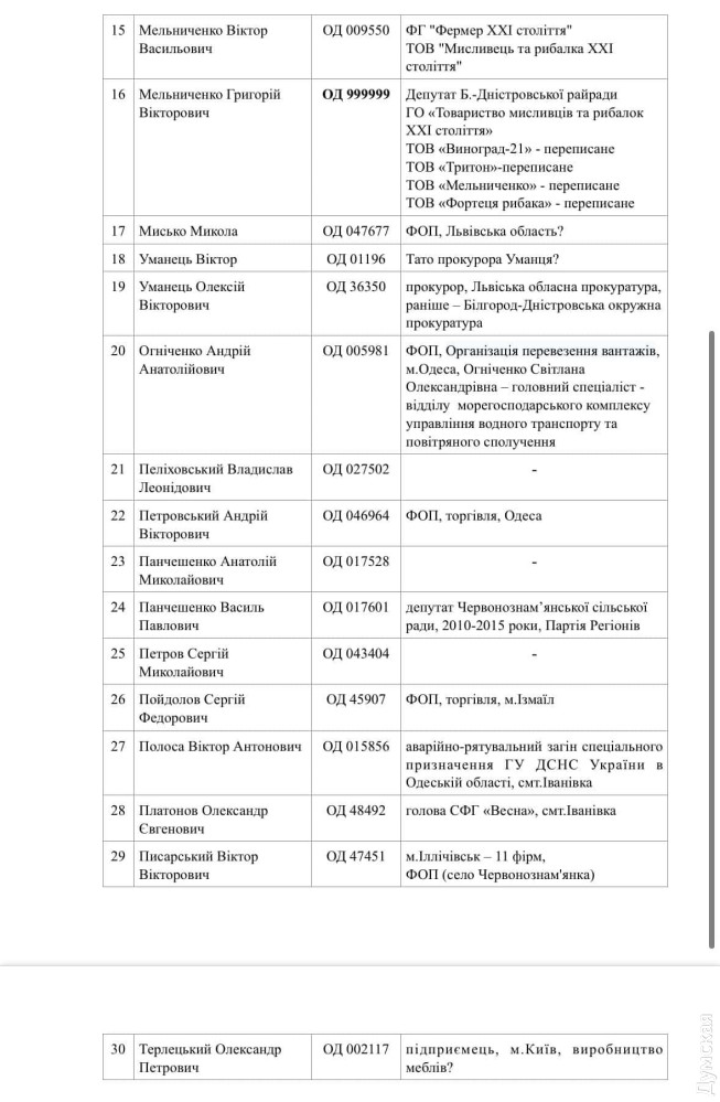 У списку, крім згаданих осіб, ще 30 прізвищ. Здебільшого підприємці, але є і представники влади. Скажімо, у ньому присутній депутат облради Сергій Біб (заборонена ОПЗЖ), прокурор Олексій Уманець, суддя окружного адмінсуду Петро Марін.