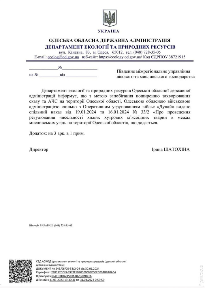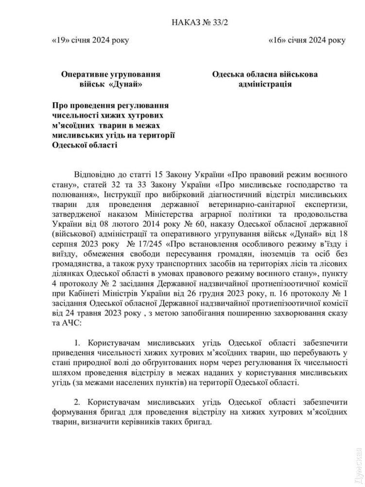Річ у тім, що у 2022-2023 роках в Україні діяла повна заборона на полювання — до закінчення повномасштабної війни. З початку 2024 року її пом'якшили. Так, у січні Одеська обласна військова адміністрація та оперативне угруповання військ «Дунай» видали спільний наказ про регулювання чисельності хижих та інших м'ясоїдних тварин, дозволивши їх відстріл до «обґрунтованих норм». Нібито це покликане запобігти поширенню сказу та африканської чуми свиней.