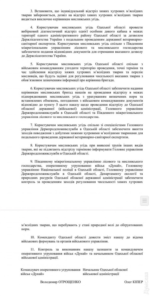 «Наказ небезпечний і маніпулятивний, — заявив науковий керівник національного природного парку «Тузловські лимани» доктор біологічних наук Іван Русєв. — Абсолютно незрозуміло, хто і як встановлював «обґрунтовану чисельність» тварин, які аргументи на користь того, що її в принципі потрібно регулювати. Я вже не кажу про те, що заради боротьби з африканською чумою свиней планується відстрілювати хутрових звірів (про це йдеться в листі обласного департаменту екології) — цілковитий абсурд».