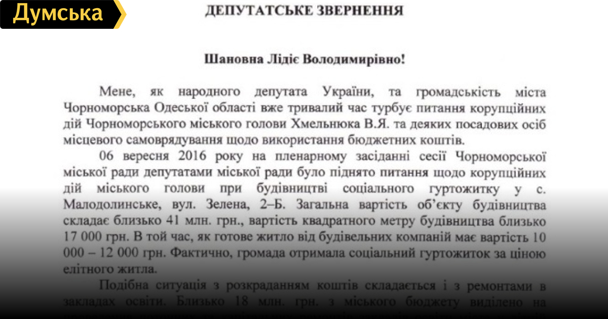 Дорогое социальное жилье, муниципальная охрана и «карманные» СМИ: нардеп рассказал государственным аудиторам как тратит бюджетные деньги мэр Черноморска ХмельнюкНародный депутат от «Народного фронта» Игорь Бриченко направил обращение главе Государственной аудиторской службы Украины Лилии Гавриловой с просьбой провести оценку эффективности использования бюджетных средств городским головой города Черноморск Одесской области Валерием Хмельнюком. В своем обращении нардеп приводит ряд примеров неэффективного и незаконного использования средств. В частности, это строительство социального общежития в селе Малодолинское. Общая стоимость объекта 41 млн грн, стоимость квадратного метра социального жилья – около 17 тысяч гривен. В то же время стоимость квадратного метра жилья от строителей здесь составляет 10-12 тысяч гривен. «Фактически город получил социальное общежитие по цене элитного жилья», — отмечается в обращении. Похожая ситуация сложилась и с проведением ремонтов в учреждениях образования, говорится в документе. Так, на капитальный ремонт учреждений образования в летний период из городского бюджета выделили 18 миллионов гривен. В июне отделение образования горсовета выбрало подрядчика для проведения ремонтных работ на общую сумму 4 миллиона – «Ильичевскую строительную компанию». По информации нардепа, компания была создана в 2015 году, а ее штате числились пятеро неквалифицированных работников, один из которых – бывший работник коммунального управления по ЖКХ, уволенный за участие в коррупционных схемах. По состоянию на начало учебного года «Ильичевская строительная компания» не смогла выполнить запланированный объем работ. Однако несмотря на это, фирма получила еще один заказ на ремонт помещений городской больницы и управления ГСЧС на общую сумму 3 миллиона гривен. Еще одна статья нецелевого расходования бюджетных средств, которую называет нардеп, финансирование коммунальных СМИ Черноморска, в частности газеты «Черноморский маяк» и ТРК «ІТ-3». В текущем году газета и телерадиокомпания получили 2,2 миллиона бюджетных гривен. При этом из бюджета отдельно были выделены средства на ремонт помещений коммунальных СМИ, закупку оборудования и мебели. «Валерий Хмельнюк использует СМИ для собственных выступлений, а также для «черного пиара» против своих оппонентов», — говорится в документе. Не менее странная ситуация сложилась и с муниципальной охраной, на которую с 2012 года потрачено 10 миллионов гривен. Нардеп Бриченко попросил руководителя Государственной аудиторской службы проверить законность и эффективность использования бюджетных средств Валерием Хмельнюком. СМЕРТЬ РОСІЙСЬКИМ ОКУПАНТАМ! Помітили помилку? Виділяйте слова з помилкою та натискайте control-enter |