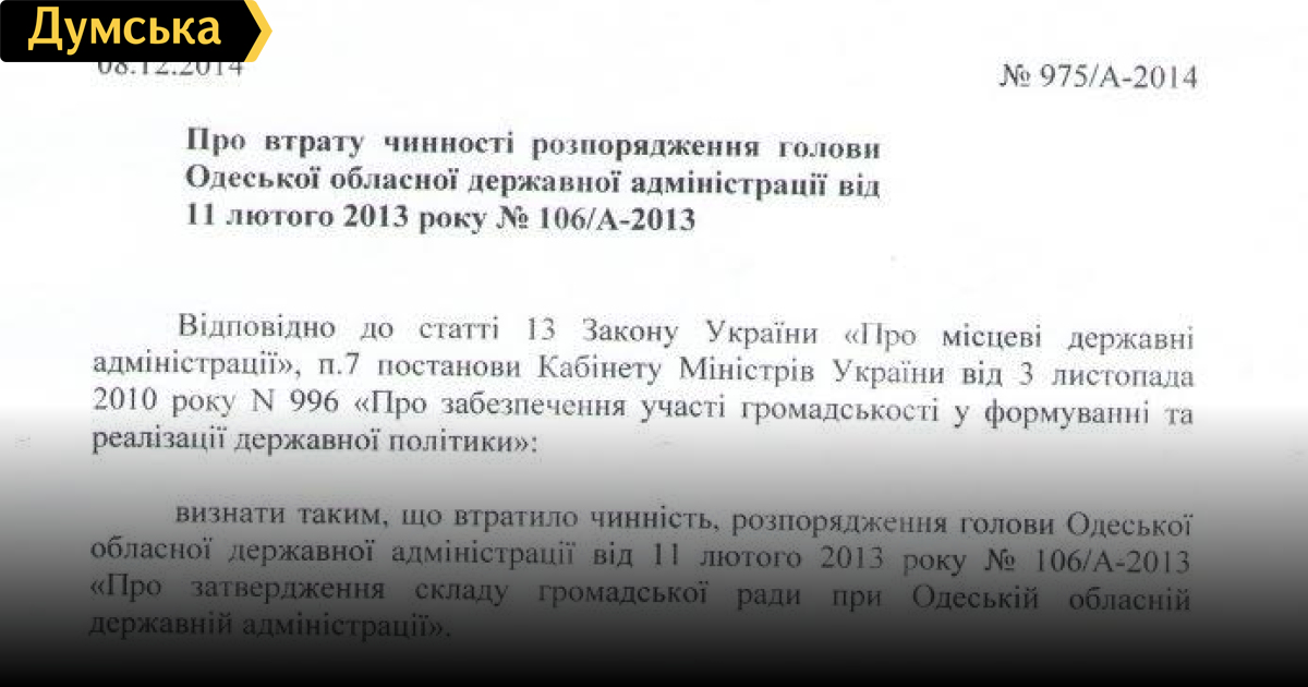 Не перестаю удивляться компетенции некоторых представителей органов власти В Постановлении КМУ от 26.11.2014 688, четко сказано, что прекратить полномочия общественных советов, образованных до 22.02.2014. Соответственно надо понимать, что с 26.11.2014 ОС при ООГА уже прекратил свои полномочия. Логично было бы от Губернатора, уже получить Распоряжение о создании инициативной группы по формированию нового состава ОС при ООГА, а не дублировать, по факту, текст постановления..