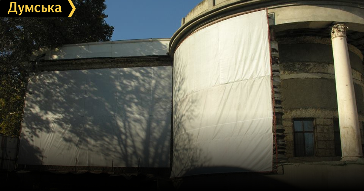 Обшарпанный дворовой фасад мэрии Одессы закрывают тканью