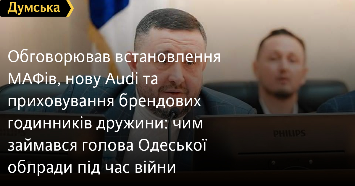 Обговорював встановлення МАФів, нову Audi та приховування брендових годинників дружини: чим займався голова Одеської облради під час війни«Думська» з'ясувала, хто присутній на аудіозаписах розмов з головою Одеської облради Григорієм Діденком, які оприлюднило НАБУ. Сьогодні чиновнику та його дружині-нардепу повідомили про підозру в недостовірному декларуванні. Одним зі співрозмовників, з яким керівник зібрання обговорює встановлення кіосків поруч із Палацом спорту, виявився директор арени Євген Філонов, депутат від забороненої ОПЗЖ. Поки вся країна перебуває у стані війни, на передовій гинуть люди, а волонтери роблять все можливе, щоб допомогти армії, Діденко і Філонов у робочому кабінеті ведуть розмови про встановлення торгових об'єктів, що взагалі не входить до компетенції голови облради. Філонов розповідає, що до нього звернулися деякі підприємці, які хотіли поставити МАФ, але вони запросили місце, яке, за його словами, «наше», на що Діденко відповідає, нехай беруть інше. Потім співрозмовники обговорюють, що для початку нехай бізнесмени візьмуть місце на три місяці, хоча ті хотіли на рік. Зазначимо, що ні Діденко, ні Філонов офіційно не мають відношення до здачі площ в оренду. Крім того, з депутатом обласної ради від «Слуги народу» Олександром Маланюком керівник регіональних зборів ділиться враженнями про нову Audi, яка серед іншого фігурує в справі, як один з активів, які сім'я Діденка придбала без підтверджених джерел доходу. Голова облради розповідає, як чудово їздить авто, а потім домовляється вже зі співробітником СТО про встановлення номерів на машину. Також на записі є розмова голови облради з його помічницею Лілією Томашевською, яка намагається з'ясувати, як декларувати дорогі брендові годинники дружини Діденка, а він каже, що може купити підробку, щоб взагалі не вносити їх до декларації. СМЕРТЬ РОСІЙСЬКИМ ОКУПАНТАМ! Помітили помилку? Виділяйте слова з помилкою та натискайте control-enter