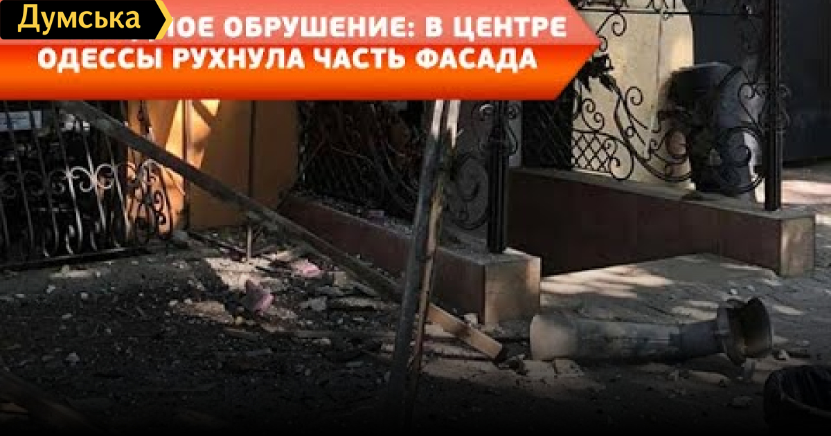В центре Одессы рухнула часть фасада памятника архитектуры. Это случилось на Соборной площади, утром 14 июля. В результате обвала никто не пострадал. Рухнувшие камни порвали электропровода и повредили вывески находящихся в здании заведений.