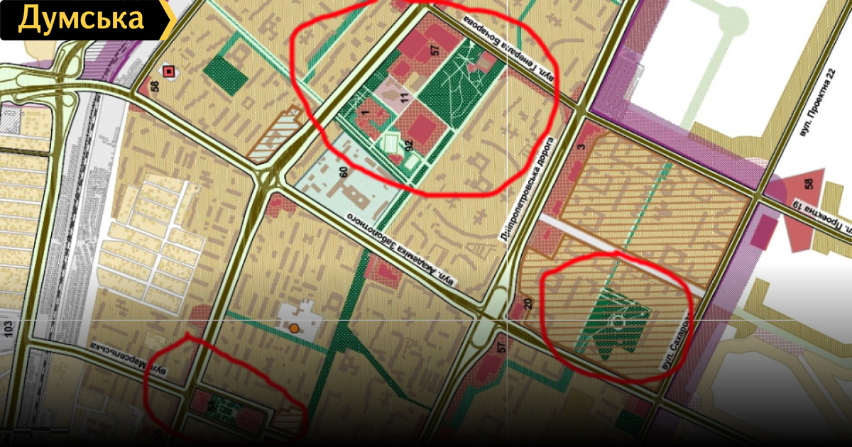 Устранены «технические ошибки», вроде заштрихованных как территория перспективной высотной застройки скверов и площадей Молдаванки. Но не все. Одна из зеленых зон на Степовой по-прежнему идет под снос (отмечена красным).