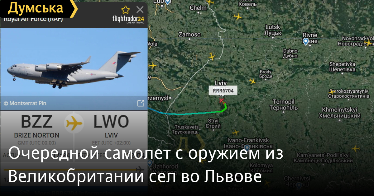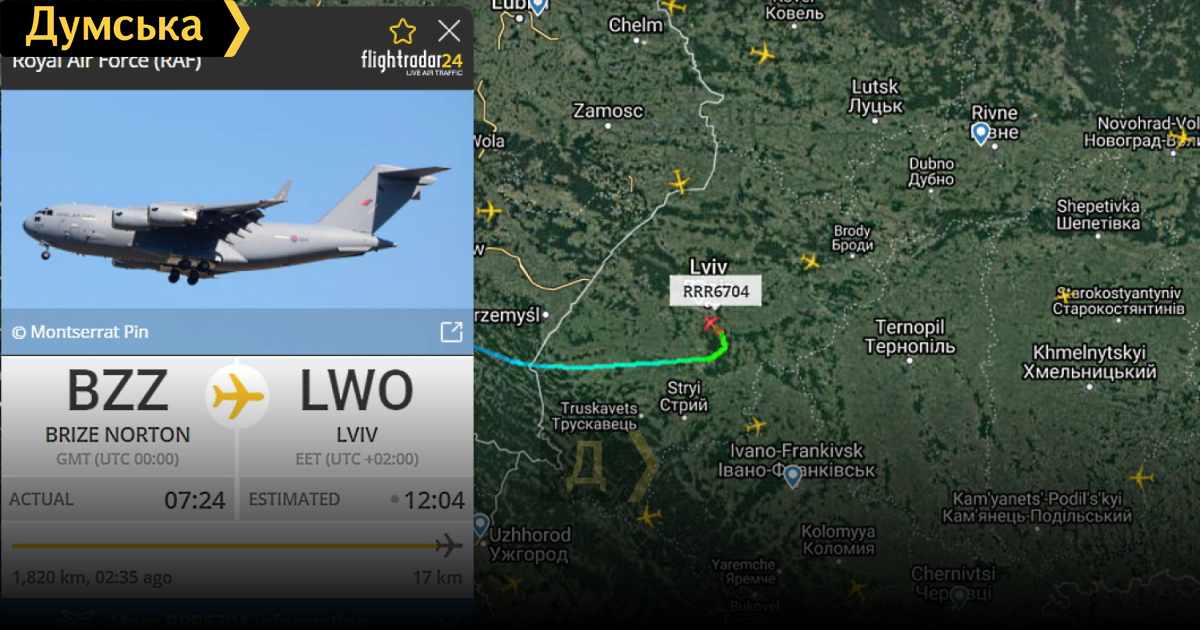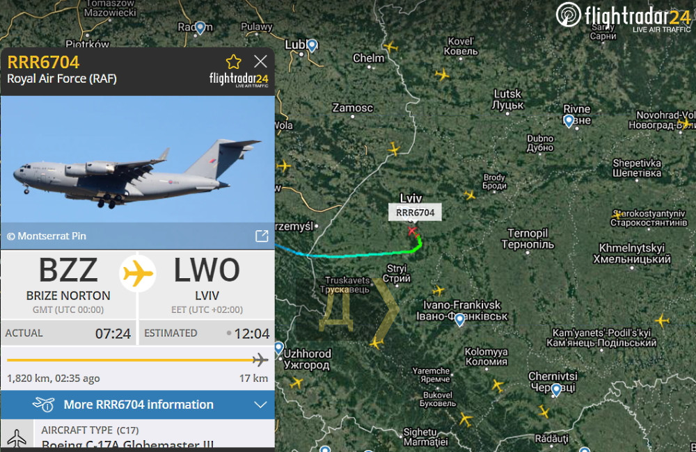 Утром военно-транспортный самолет Boeing C-17 Gloubmaster III вылетел с британской авиабазы Брайз Нортон, а в 12:04 приземлился во Львове.