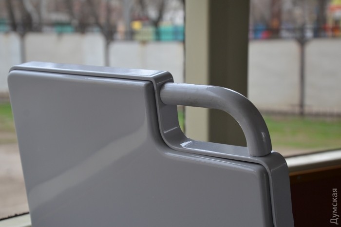 «Сидения выполнены на металлическом каркасе, там стеклопластиковая обшивка, она полностью соответствует стандартам по негорючести, они прочнее прежних, выдерживают на излом до 450 килограммов. Данная конструкция сидений успешно прошла испытания в европейских лабораториях на соответствие всем возможным нормам. Кроме того, они имеют современный дизайн», — говорит заместитель директора КП «Одесгорэлектротранс» Александр Каташинский.