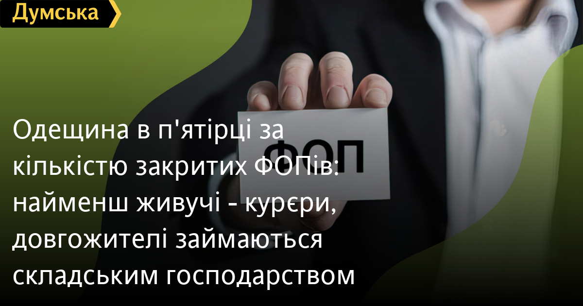 Одещина в п'ятірці за кількістю закритих ФОПів: найменш живучі — кур’єри, довгожителі займаються складським господарствомЧетверте місце в Україні зайняла Одеська область за кількістю закритих ФОПів впродовж 11 місяців минуло року. Всього в нашому регіоні припинили роботу 18 714 підприємців. Як повідомили аналітики сервісу Опендатабот, перше місце в країні за кількістю закритих ФОПів зайняв Київ — 32 469. За ним йде Дніпропетровщина (22 645), Харківщина (20 481), а замикає п'ятірку Львівщина (16 521). Всього від початку 2025 року в Україні припинили своє існування 250 209 підприємців. За даними аналітиків, найбільш вразливими торік були ФОПи, що працюють у роздрібній торгівлі — на них припадає третина закриттів (77 705). В середньому, такі бізнеси існують менш як три роки. У сфері оптової торгівлі завершили свою роботу 16 909 підприємців. Тривалість їх життя ледь перевалює за рік. З великим відривом другими за кількістю припинень стали айтівці — 28 668, при цьому вони ж опинилися серед підприємців-довгожителів — 3 роки 11 місяців. Довше за всіх в Україні працюють ФОПи, що займаються складським господарством — більш ніж 6 років. Термін існування підприємців у сфері операцій з нерухомістю трохи менший — 5 років та 11 місяців. Замикають трійцю бізнеси у сфері ремонту техніки, зокрема, побутової: 5 років і 9 місяців. А ось найменш живучими є ФОПи-кур’єри — в середньому вони працюють лише 6 місяців. Бізнеси, що займаються адміністративною та допоміжною офісною діяльністю тримаються на плаву 9 місяців. В середньому в Україні пересічний ФОП працює 2,4 роки. Нагадаємо, нещодавно «Думська» розповідала, як працює малий бізнес в Одесі під час війни. СМЕРТЬ РОСІЙСЬКИМ ОКУПАНТАМ! Помітили помилку? Виділяйте слова з помилкою та натискайте control-enter |
