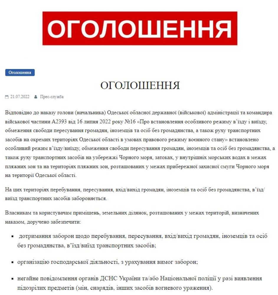 Голова Одеської обласної військової адміністрації полковник Максим Марченко та командувач оперативного командування «Південь» генерал-майор Андрій Ковальчук скасували свій спільний наказ №9 від 21 травня 2022 року, яким було накладено заборону на відвідування пляжів регіону.