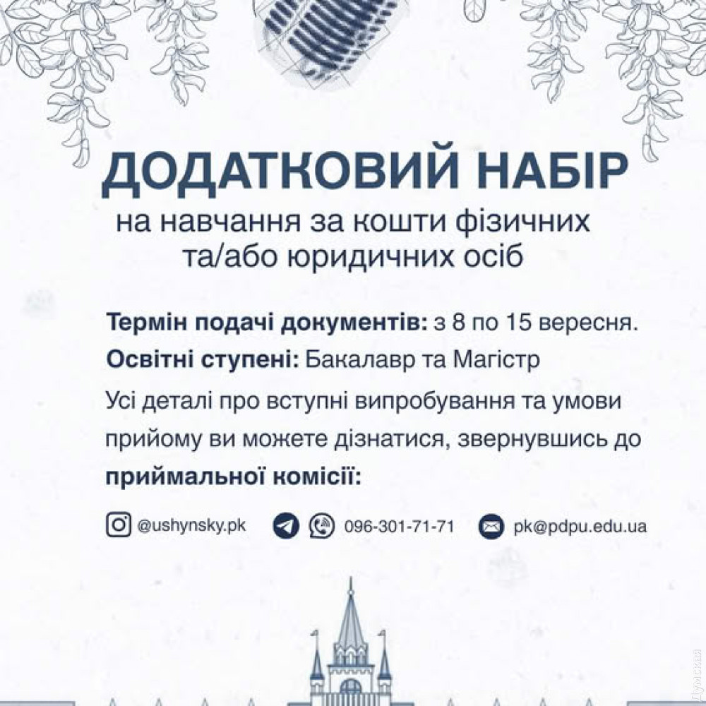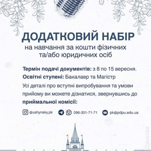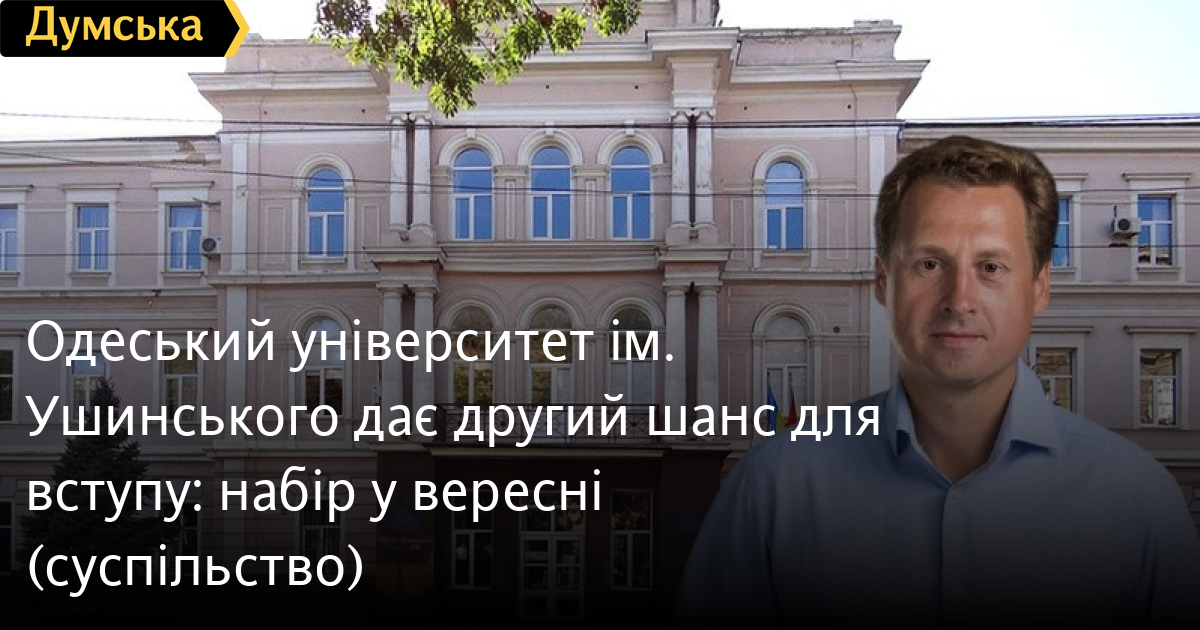 Одеський університет ім. Ушинського дає другий шанс для вступу: набір у вересні (суспільство)Південноукраїнський національний педагогічний університет імені Ушинського оголосив додатковий набір студентів на навчання за кошти фізичних та/або юридичних осіб. Якщо ви не встигли подати документи в основні строки, тепер маєте шанс долучитися до студентської спільноти одного з найстаріших педагогічних вишів країни. Прийом документів триватиме з 8 по 15 вересня. Набір відкрито на освітні ступені «Бакалавр» і «Магістр». За деталями щодо вступних випробувань та умов прийому можна звертатися до приймальної комісії: • Viber / Telegram: 096-301-71-71 • Instagram: @ushynsky.pk • Email: pk@pdpu.edu.ua Не втрачайте можливість стати частиною нашої великої освітньої родини! СМЕРТЬ РОСІЙСЬКИМ ОКУПАНТАМ! Помітили помилку? Виділяйте слова з помилкою та натискайте control-enter |