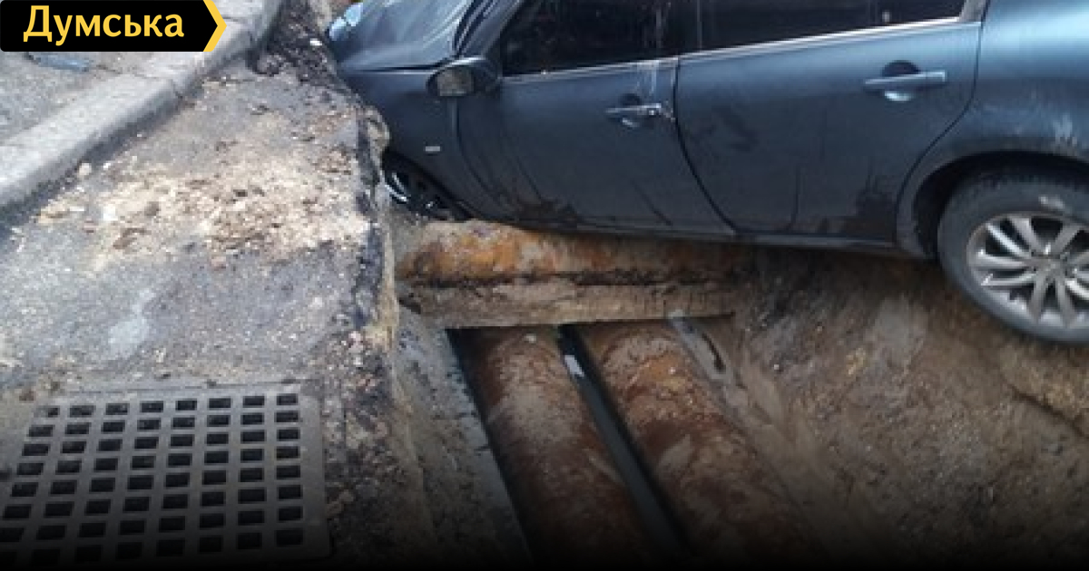 14 мая на перекрестке улиц Пастера и Ольгиевской автомобиль Infiniti провалился в траншею, вырытую коммунальщиками.