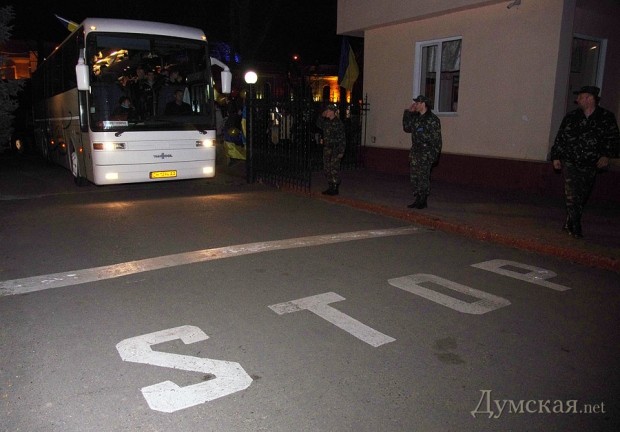 Автобусы с доброй сотней курсантов, 50 офицерами вуза и боевым знаменем Академии выехали из Севастополя еще в 10 часов утра, но до Одессы добрались только после полуночи. Как оказалось, почти пять часов колонна простояла на российском блокпосту в районе Армянска.