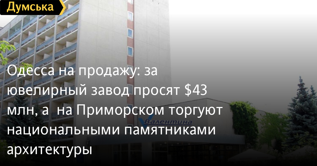 Итак, судя по сетевым объявлениям, два самых дорогих объекта в нашем городе — это девятиэтажная гостиница «Валентина» на Французском бульваре и имущественный комплекс Одесского ювелирного завода на Софиевской. За первую продавцы просят 47 «с копейками» миллионов долларов США, за второй – 43 млн «зеленых».