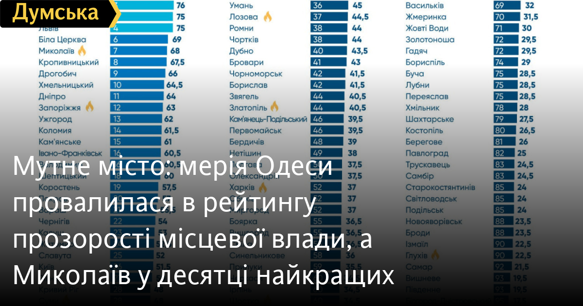 Мутне місто: мерія Одеси провалилася в рейтингу прозорості місцевої влади, а Миколаїв у десятці найкращихОдеса стала «непрозорим» містом, погіршивши показники відкритості влади порівняно з 2023 роком (з 53,3% до 45,5%). Водночас у трьох містах регіону ситуація ще гірша — Білгород-Дністровський, Південне та Ізмаїл — у найгіршій десятці, передає кореспондент «Думської», який вивчив доповідь Transparency International Ukraine. Експерти опублікували оновлений рейтинг 100 українських міст в умовах повномасштабної війни, доступність нашого міста нижча за середню по країні (59,1%). Оцінка проводилася за 70 критеріями — від відкритості сесій міськради до доступності даних про використання комунального майна. Лідерами стали Чернівці, Вінниця та Луцьк. Серед прифронтових міст відзначився Миколаїв — наш сусід у десятці найкращих. А ось Одеса, попри свої розміри, ресурси та амбіції, до списку прозорих, і навіть частково прозорих, потрапити не змогла. Місто невибагливо затесалося між Південноукраїнськом і Ковелем, посівши 34 сходинку. Ба більше, Одеса примудрилася опуститися: з частково прозорої стати непрозорою. Крім наші показники погіршили ще 6 міст. Із сотні. При цьому джерела «Думської» в мерії запевняють — змін у роботі муніципалітету не було, тож причини погіршення показників — у змінах підходів Transparency International Ukraine, чого ті й не приховують.