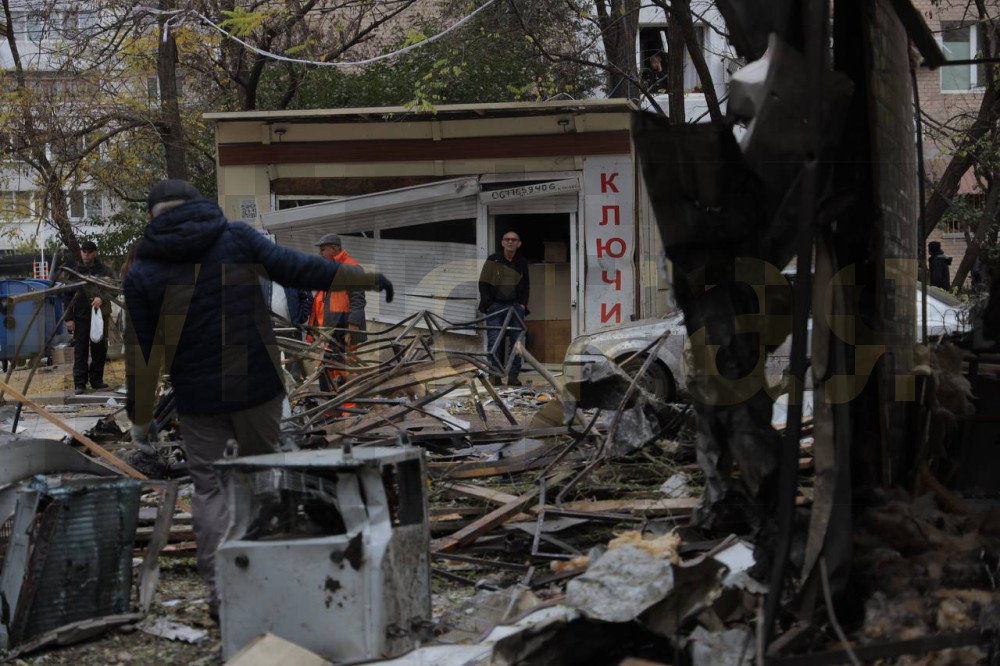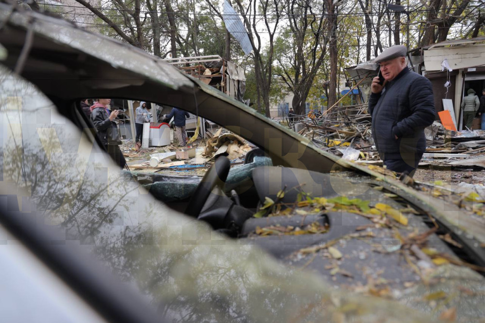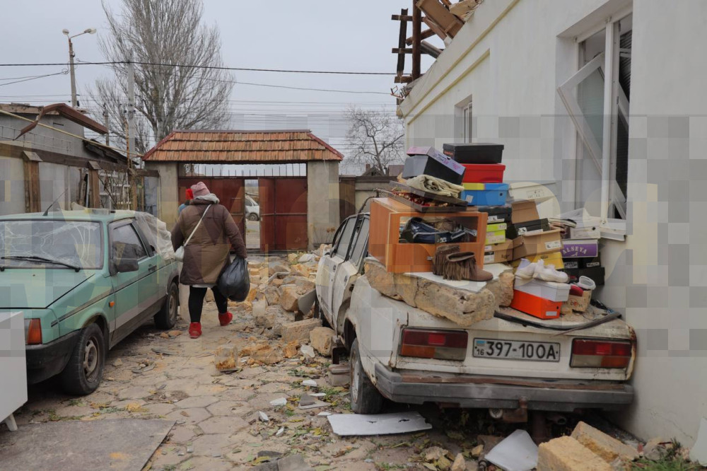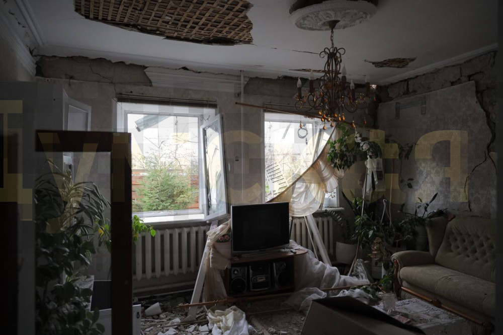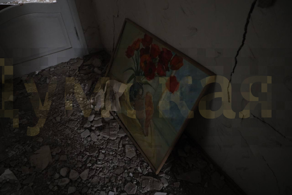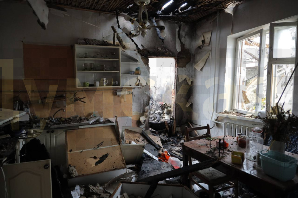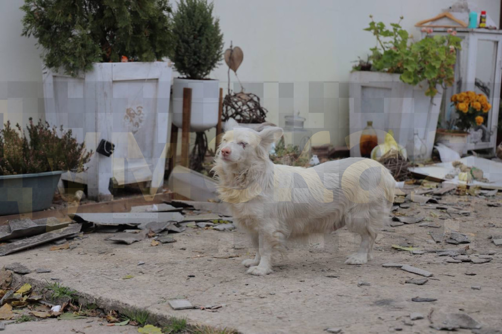 Дрон спікірував просто на приватний будинок, поруч із кухнею. Господиня Олена та її друг ледь стримують сльози. Будинок відновленню не підлягає. Від самого ранку її родичі допомагають збирати вцілілі речі. Подвір'ям серед розкиданого каміння черепашнику бігає невеликий білий песик. Під оком у нього видно свіжу подряпину — пошкодження від скла, що вилетіло.