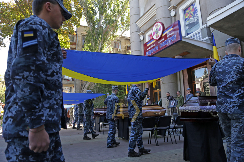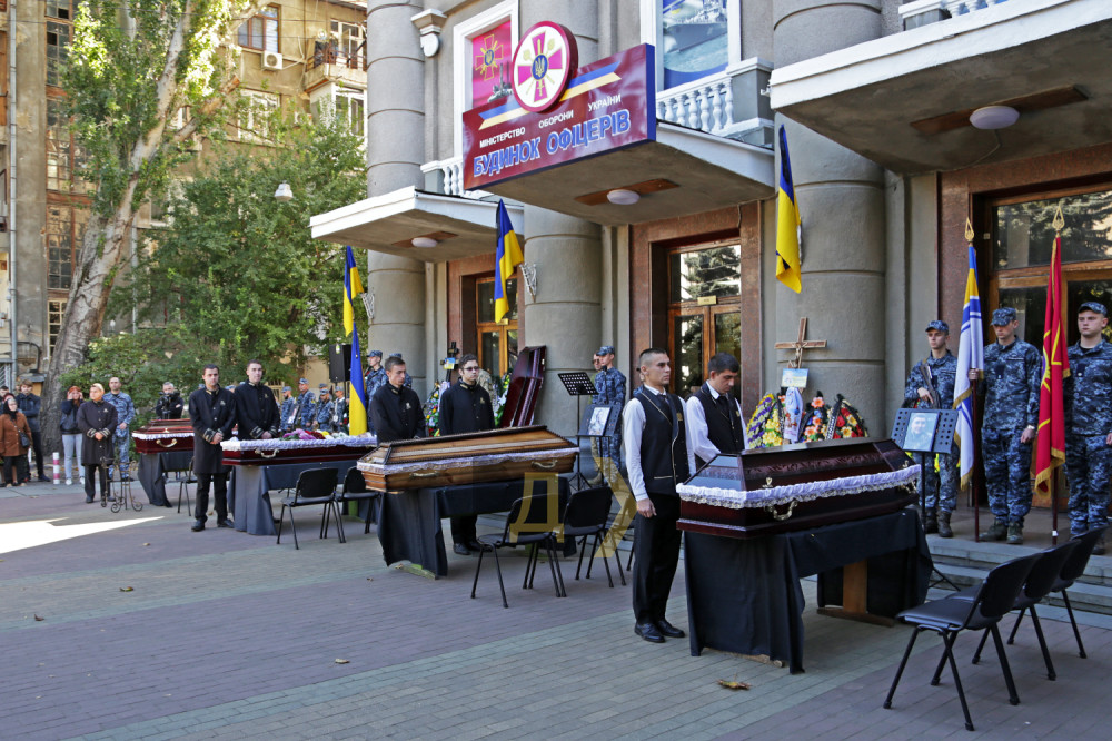 Десятки людей прийшли вшанувати пам'ять командира бойової машини роти морської піхоти старшини Віталія Кузочкіна, матроса Анатолія Чопенка, командира механізованої роти старшого лейтенанта Дениса Плотнікова та заступника командира батареї протитанкових керованих ракет старшого лейтенанта Юрія Назарука, передає кореспондент «Думської».