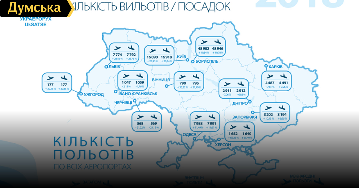 В 2018 году украинцы в целом стали чаще летать. Так, предприятие предоставило услуги по обслуживанию 300 853 рейсов иностранных и украинских авиакомпаний, что на 18,5% больше, чем в 2017-м.