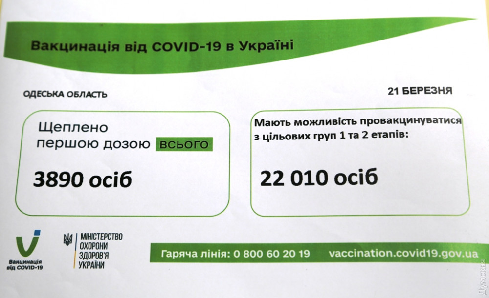 Директор областного центра общественного здоровья Оксана Пастернак рассказала, что с сегодняшнего дня в Одесской области начали работать 20 стационарных пунктов вакцинации против коронавируса. Из них пять находятся в Одессе, по одному — в Измаиле, Подольске, Березовке, Ивановке, Болграде, Великой Михайловке, Белгороде-Днестровском, Захарьевке, Кодыме, Доброславе, Любашевке, Овидиополе, Авангарде, Ширяево и Саврани.