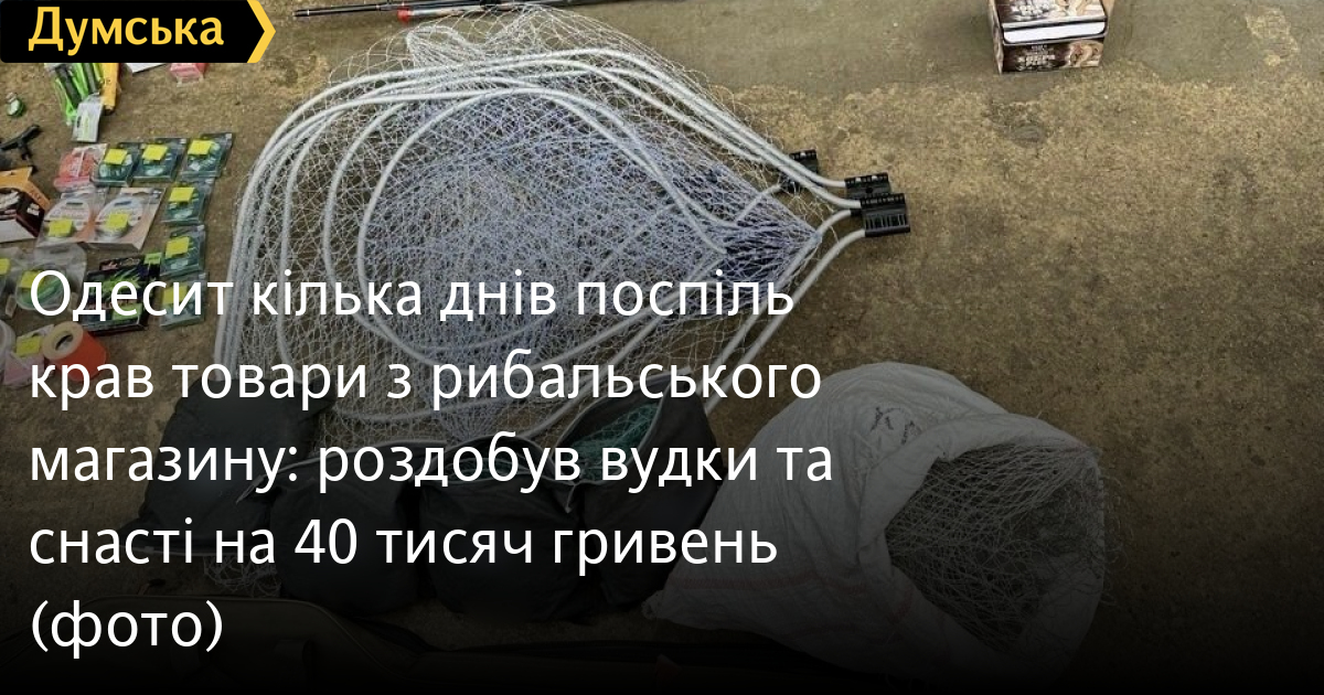Одесит кілька днів поспіль крав товари з рибальського магазину: роздобув вудки та снасті на 40 тисяч гривеньПоліція затримала одесита, який протягом кількох днів проникав у непрацюючий рибальський магазин на Тираспольському шосе та виносив звідти товари. У ГУНП повідомили, що «видобуток» загальною вартістю понад 40 тисяч гривень злодій незабаром із гарною знижкою продав незнайомцю. Покупця невдовзі розшукали. Він віддав поліцейським 18 вудок і тримачів для них, снасті, сіті та інше рибальське приладдя. Затриманий злодій розповів, що за допомогою лому зірвав замок на дверях магазину, крім товарів він також забрав 500 грн із каси. Чоловікові інкримінують злочин, передбачений 185 статтею Кримінального кодексу України (крадіжка). Йому загрожує від п'яти до восьми років ув'язнення. Помітили помилку? Виділяйте слова з помилкою та натискайте control-enter Новини по цій темі: 29 липня 2025: В Усатово Одеської області сталася перестрілка: поліція працює на місці (відео, оновлено) 28 липня 2025: П'яний на "Ягуарі" або гіпертонік? Звільнений топ-посадовець одеської поліції хоче повернутися на службу 19 червня 2025: Дівчинку, яку шукали сотні одеситів, знайшли вбитою: поліція працює з чоловіком, ймовірно причетним до загибелі 27 травня 2025: Увели гектар в університету: на Одещині засудили земельних аферистів, але без посадки і Хвоста |