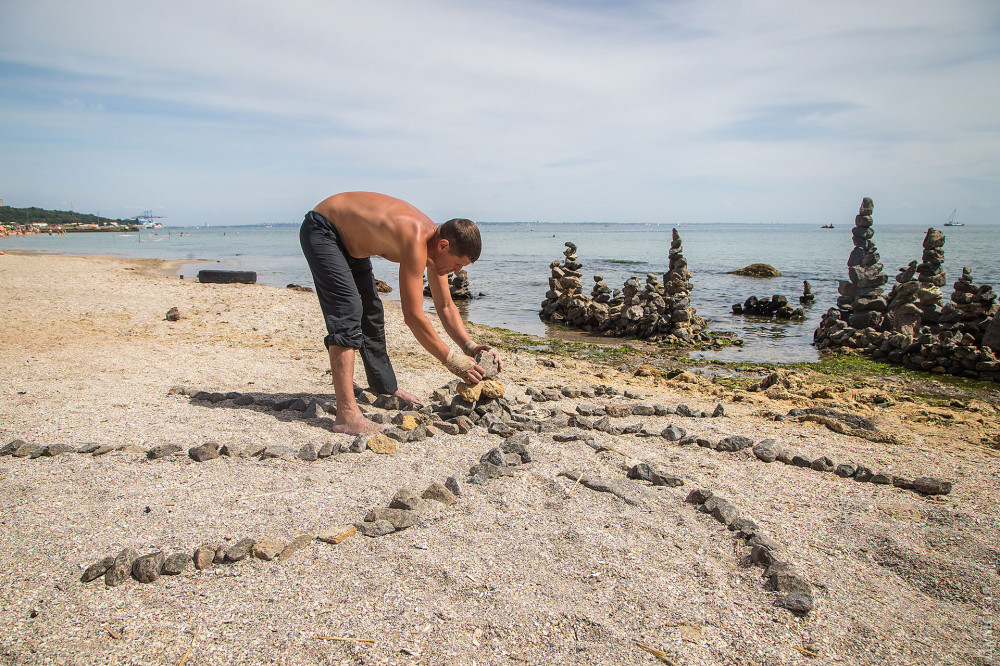 Огромные гранитные валуны, брошенные здесь во времена берегоукрепления, теперь выстроились в стройные ряды и балансируют друг на друге, создавая причудливый каменный лес. Сад камней вот уже два месяца возводит одессит Александр Изман.