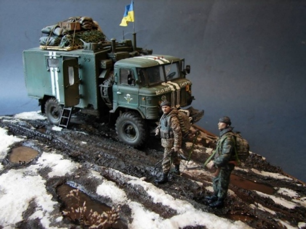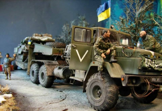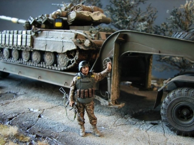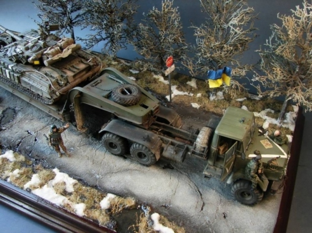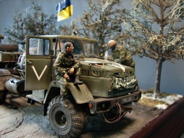«К сожалению, война разразилась и у нас, — рассказывает Евгений. — За короткое время мне удалось создать две диорамы, на которых запечатлены воины Вооруженных Сил Украины в зоне вооруженного конфликта на Донбассе. Вскоре планирую сделать еще две небольшие диорамы, посвященные также воинам АТО».