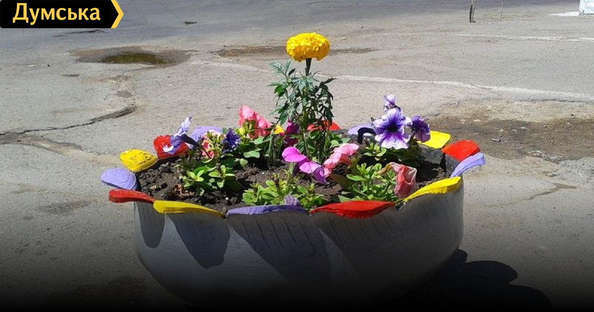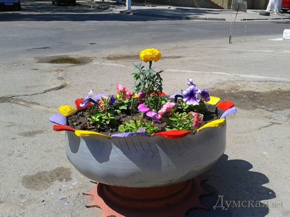 Одессит Дмитрий признался, что идею клумб «подсмотрел в интернете, но вырезал узоры на покрышках интуитивно», пишет «Одесская жизнь». Прохожие довольны творчеством Дмитрия, ведь некогда угрюмый участок улицы теперь выглядит очень уютно.