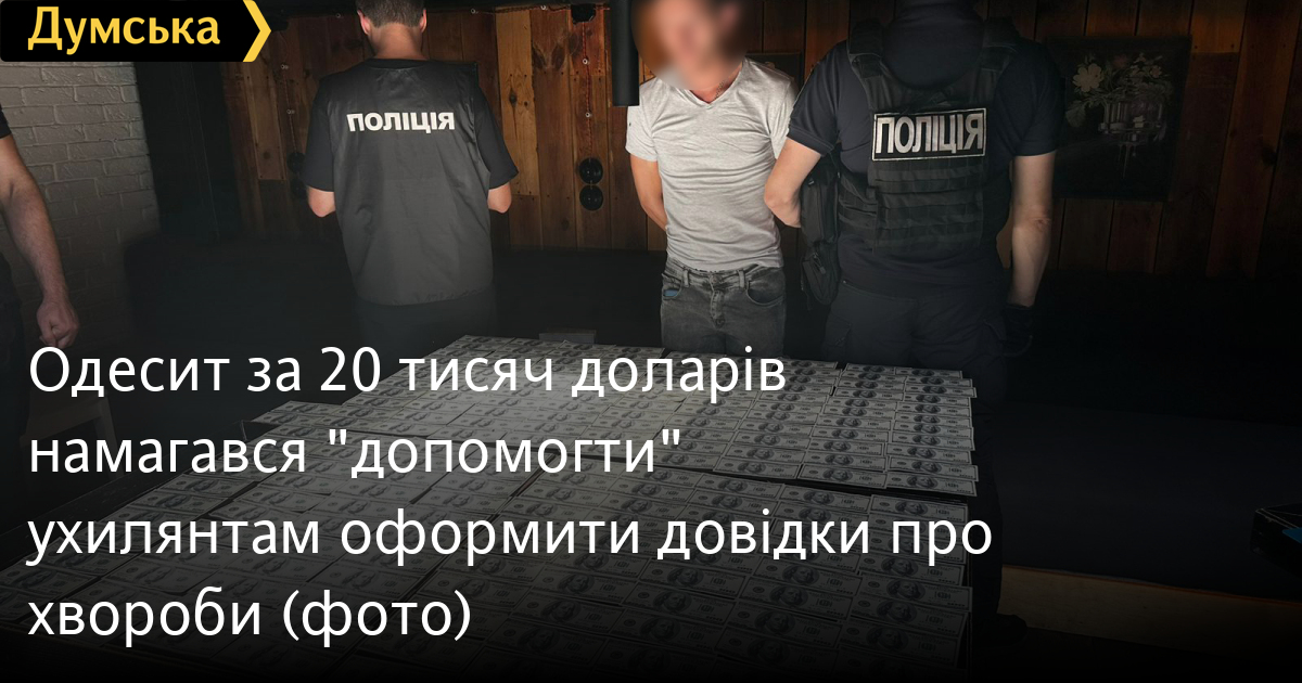Одесит за 20 тисяч доларів намагався «допомогти» ухилянтам оформити довідки про хворобиПоліція затримала одесита під час отримання 20 тисяч доларів за оформлення двом чоловікам призовного віку довідок про непридатність до військової служби. У ГУНП повідомили, що фігурант обіцяв «домовиться» з працівниками районного центру комплектування та соцпідтримки і медичного закладу. Його спільників також викрили. Відкрито провадження за ст.369-2 Кримінального кодексу України (зловживання впливом). Помітили помилку? Виділяйте слова з помилкою та натискайте control-enter Новини по цій темі: 12 серпня 2025: Як у кіно: в Одесі затримали драгдилера з партією психотропів на 20 мільйонів (фото) 9 серпня 2025: Обіцяла «закрити очі» на порушення: працівницю Одеської митниці спіймали на хабарі у чверть мільйона гривень 4 серпня 2025: Експертизу не зробили, камери не подивилися: одеські волонтери скаржаться на саботаж поліції у розслідуванні вбивства собаки 29 липня 2025: В Усатово Одеської області сталася перестрілка: поліція працює на місці (відео, оновлено) |