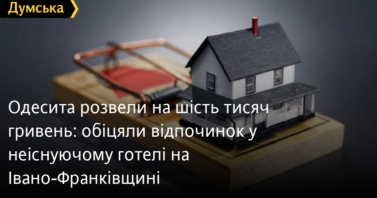 Одесита розвели на шість тисяч гривень: обіцяли відпочинок у неіснуючому готелі на Івано-ФранківщиніШість тисяч гривень втратив турист-невдаха з Одеси, який перерахував аферистам гроші за відпочинок на Галичині. Коли чоловік приїхав на місце, з'ясувалося, що готелю, в якому він планував відпочити, просто не існує, повідомили в поліції Івано-Франківщини. 38-річний одесит через соціальну мережу забронював житло у Карпатах. Після переказу коштів аферисти перестали відповідати на телефонні дзвінки та повідомлення. Однак, коли потерпілий приїхав на місце, виявилась, що такого готелю не існує. Це не поодинокий випадок на Івано-Франківщині. Поліцейські попереджають, шахраї виманюють гроші під приводом здачі житла за привабливими цінами. Після перших усних домовленостей, «орендодавець» просить аванс, як гарантію. Однак після переведення грошей, з аферистами обривається зв’язок. СМЕРТЬ РОСІЙСЬКИМ ОКУПАНТАМ! Помітили помилку? Виділяйте слова з помилкою та натискайте control-enter |