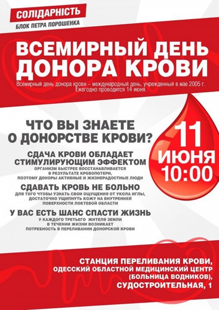 11 июня по инициативе Блока Петра Порошенко «Солидарность» на территории Одесского областного медицинского центра (ул. Судостроительная, 1) состоится акция по сдаче крови. Как сообщают организаторы, мероприятие приурочено к Всемирному дню донора крови. «Всем известно, что доноры — активные и жизнерадостные люди, а лица, постоянно сдающие кровь, – одни из самых здоровых людей на планете, — отмечается в анонсе. – Кроме того, каждый донор совершенно бесплатно получит анализ крови на такие заболевания как ВИЧ, гепатит, сифилис и другие». Начало – в 10:00. СМЕРТЬ РОСІЙСЬКИМ ОКУПАНТАМ! Помітили помилку? Виділяйте слова з помилкою та натискайте control-enter |