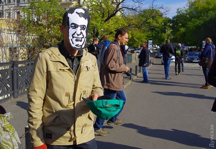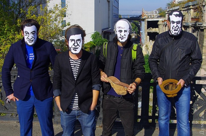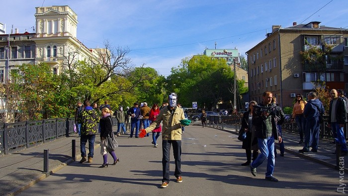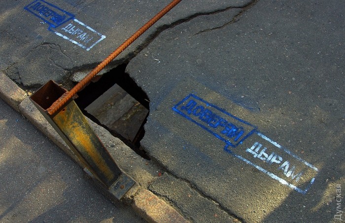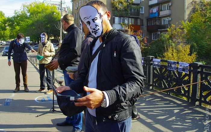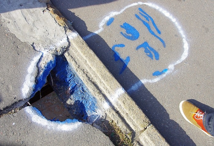 Сомнительная, с художественной точки зрения, акция включала в себя сразу несколько пунктов. Для начала активисты разрисовали асфальт граффити с призывом «доверять дырам» и карикатурой на нынешнего председателя городского совета. После демонстрации фотографий, иллюстрирующих многолетнюю историю моста, участники нарядились в маски четырех одесских мэров с 1994 года и начали клянчить у журналистов и прохожих мелочь на ремонт моста.