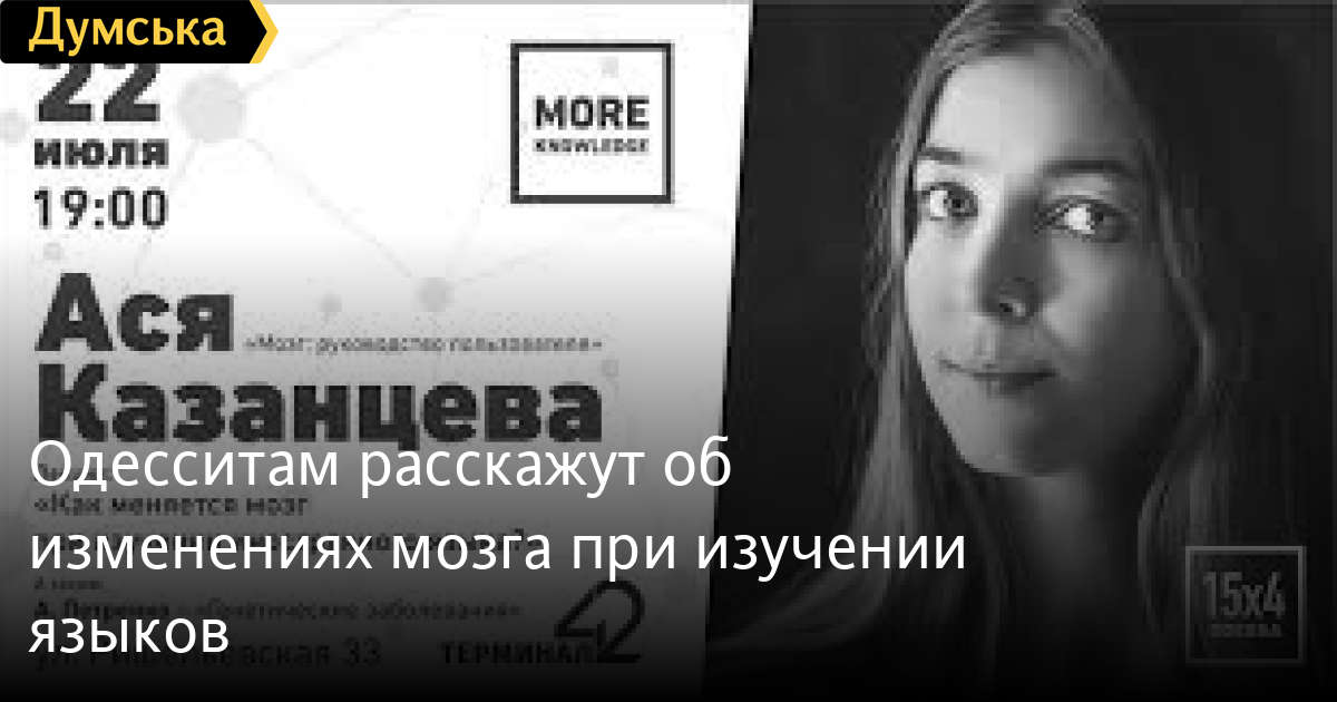 22 июля в Одессе состоится бесплатная лекция научного журналиста, лауреата премии «Просветитель», автора книг-бестселлеров об иррациональном человеческом поведении Аси Казанцевой. Тема лекции «Как меняется мозг при изучении иностранного языка». В рамках нового формата часовых лекций More Knowledge от лектория 15x4 Одесса Ася расскажет об особенностях работы мозга во время изучения родного и иностранных языков, разнице между этими процессами и оптимальном возрасте для освоения языков. Ася Казанцева в настоящий момент работает над магистерской диссертацией в рамках программы «Когнитивные науки и технологии» НИУ ВШЭ. Регулярно приезжает в Украину с научно-популярными лекциями. В 2016 году уже выступала в Одессе, Львове, Харькове и Киеве. В мероприятии также примет участие эмбриолог Александр Петренко с короткой лекцией о генетических заболеваниях. Отметим, лекции проходят в рамках международного тура «Мозг: руководство пользователя». Начало в 19:00 по адресу ул. Ришельевская, 33 «Терминал 42». СМЕРТЬ РОСІЙСЬКИМ ОКУПАНТАМ! Помітили помилку? Виділяйте слова з помилкою та натискайте control-enter |