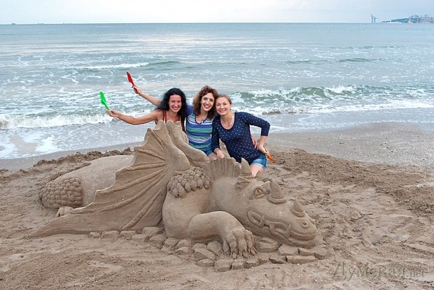 Девушка редко работает в одиночестве — своим энтузиазмом она заразила всех подруг. Вот и для работы над самой большой скульптурой – песочным драконом по имени Любомир — на помощь Ирине пришли киевлянка Оксана и одесситка Екатерина. Присоединился к ним и ваш покорный слуга.