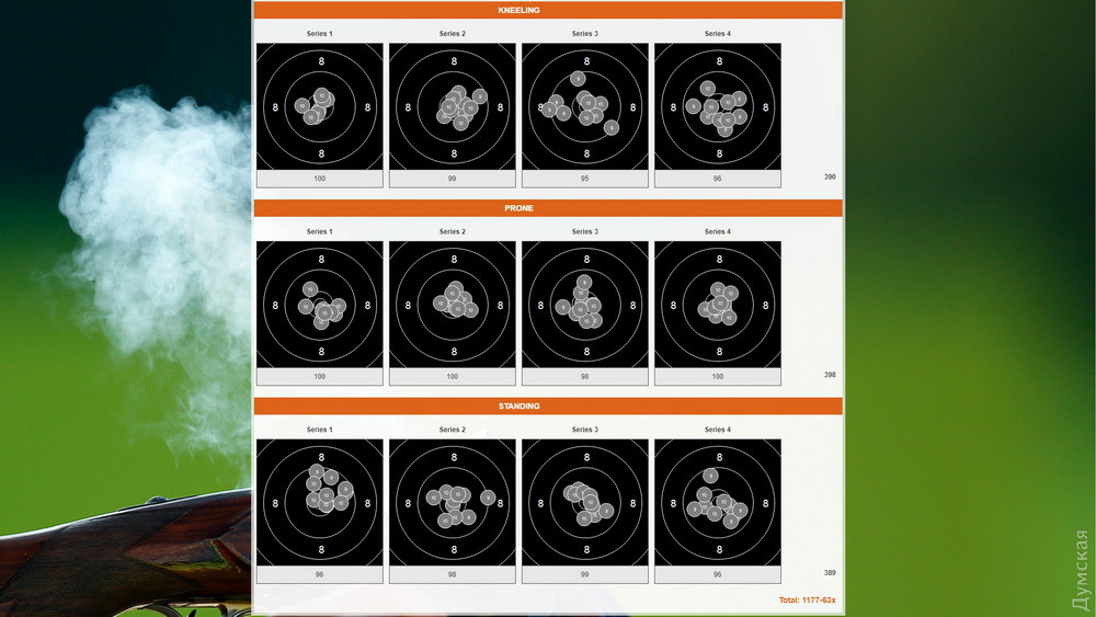 Как сообщили в одесском отделении Национального олимпийского комитета, в стрельбе из малокалиберной винтовки из трех положений на дистанции 50 метров наша землячка показала результат 1177 очков, что на три очка превышает рекорд Украины, установленный киевлянкой Натальей Кальниш, и всего на пять очков ниже мирового рекорда.
