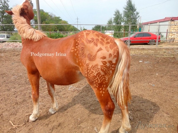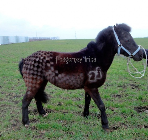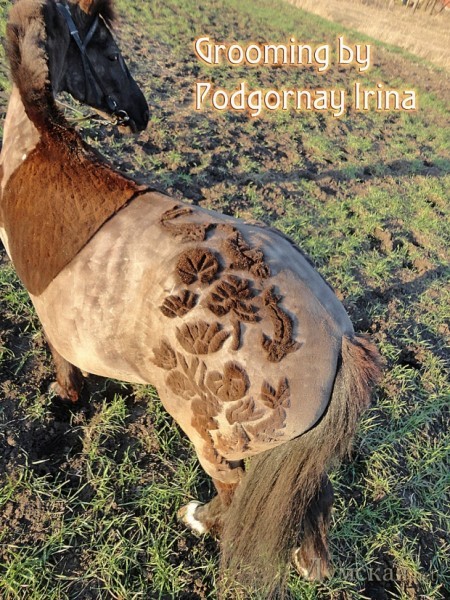 Грумер встречает нас на пороге частного дома, который силами тренера по верховой езде Ирины Ананченко превратился в конно-спортивный клуб «Вдохновение». Тут не салон красоты — никаких зеркал и фотографий знаменитостей из мира лошадей. Работают на свежем воздухе, прямо во дворе, и пока крупный уэльский пони Деля, переминаясь с ноги на ноги, мерно поглощает сено, Ирина Подгорная в одежде, которую не жаль и запачкать, украшает заднюю часть животного узорами из лотосов и японских карпов кои. Работа кропотливая, а потому занимает немало времени. На то, чтобы узорно постричь пони, уходит пять часов с небольшим перерывом. Даже Деля (так зовут непарнокопытное), уже привыкшая к жужжанию машинки и щелканью ножниц, нуждается в отдыхе, что уж говорить о мастерице.